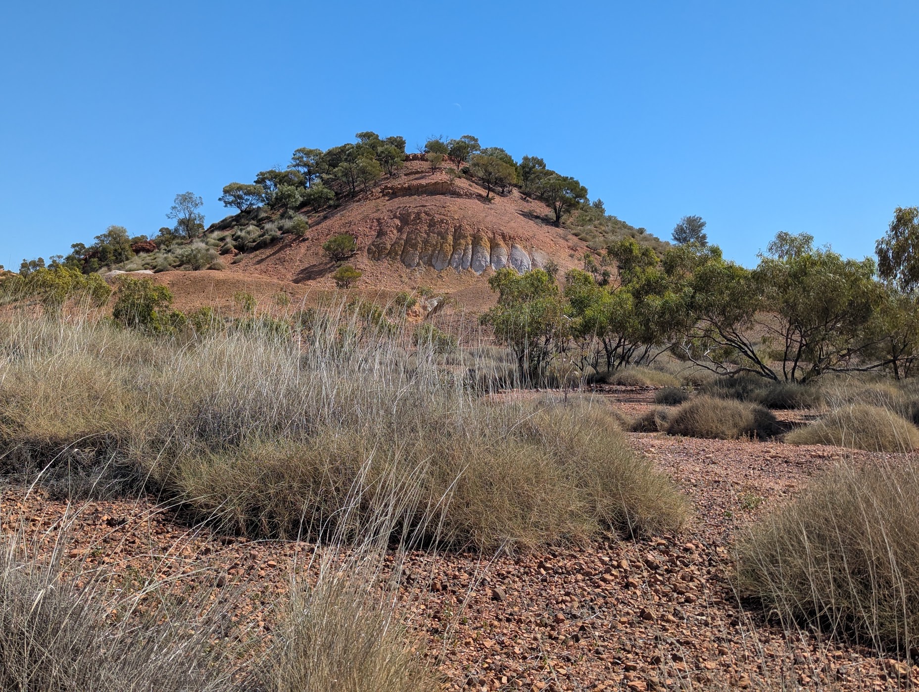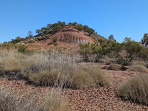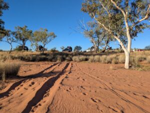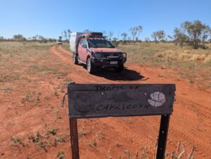 The track would test both cars and drivers over five days. With Mt Tietkens, Mt Smith and Mt Winnecke in the distance we drove along the grass and spinifex plains. Bushes, bloodwoods and gums dotted the landscape, as we followed the Hay River with red gums lining its edges. We passed over the Tropic of Capricorn and on to the dingo well. The dingo well is an unnatural water supply established by some researchers who believe that by supplying water to the dingoes would increase their population and therefore decrease the non-native pests in the area. Do those pests also drink from the well? Anyway, the tap wasn’t working and therefore no water was available. We did see one dingo and many dog tracks along the Hay River Track.