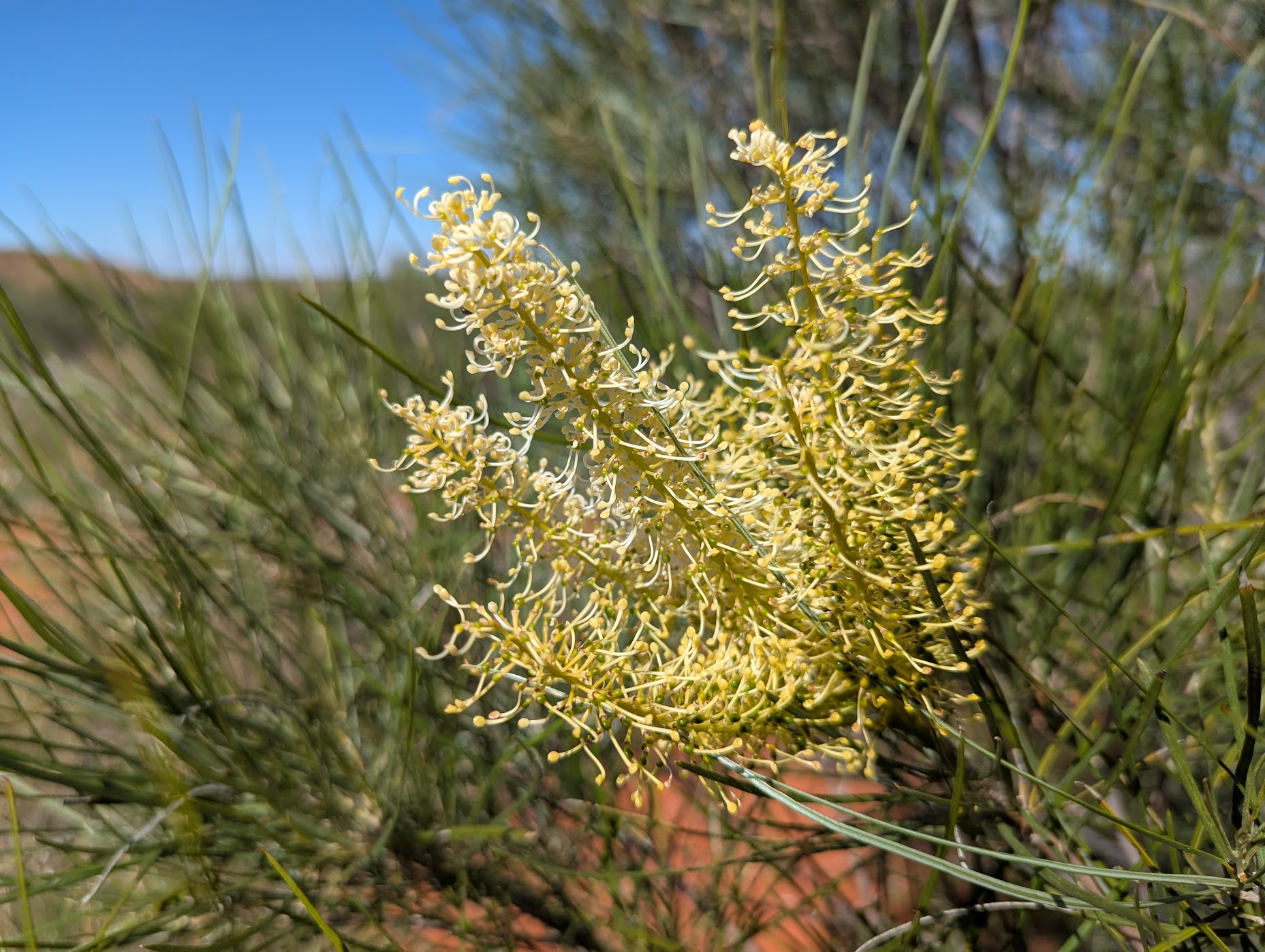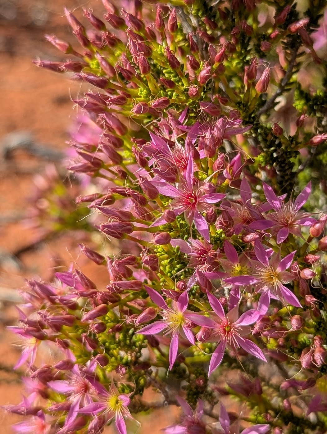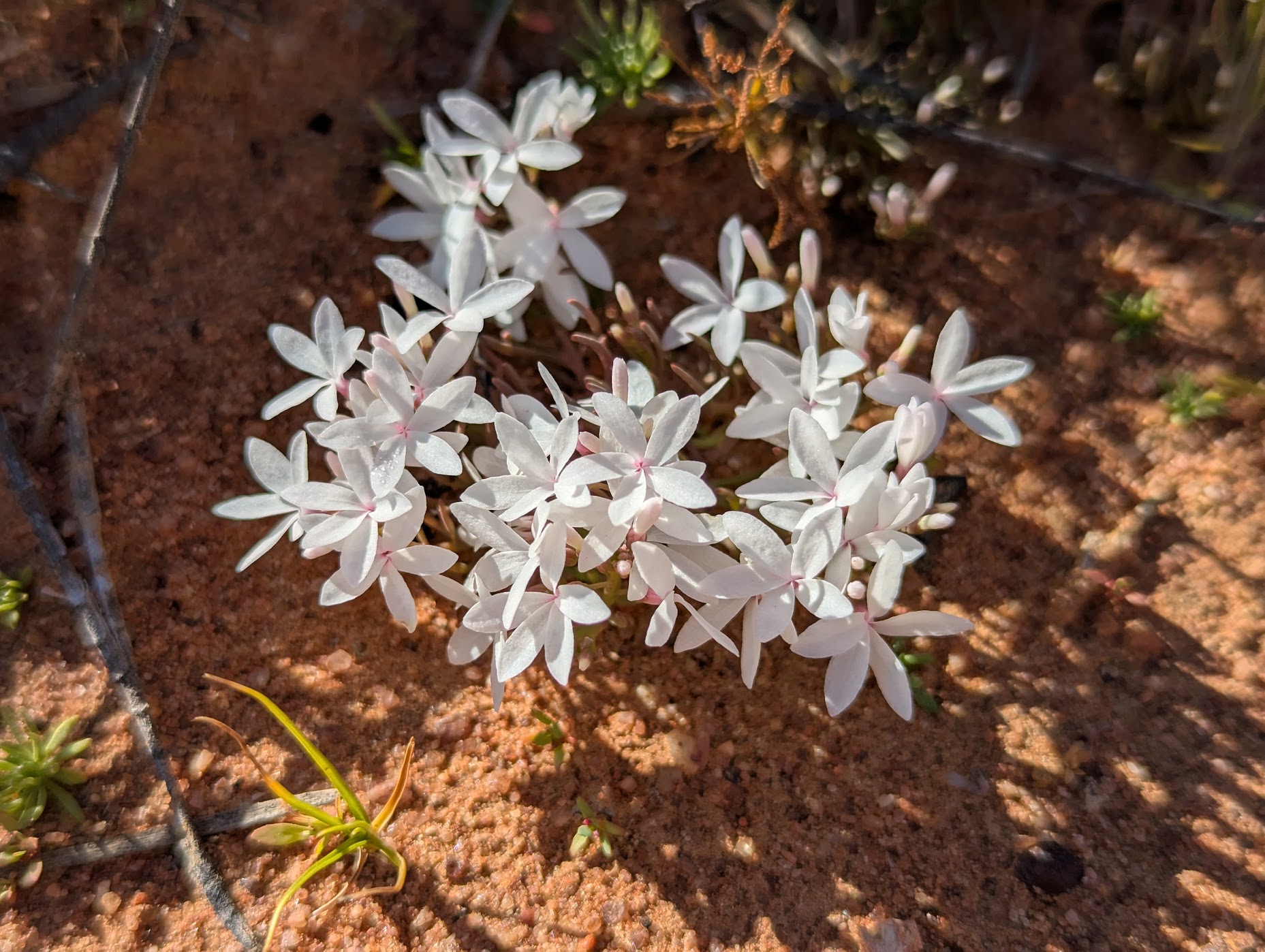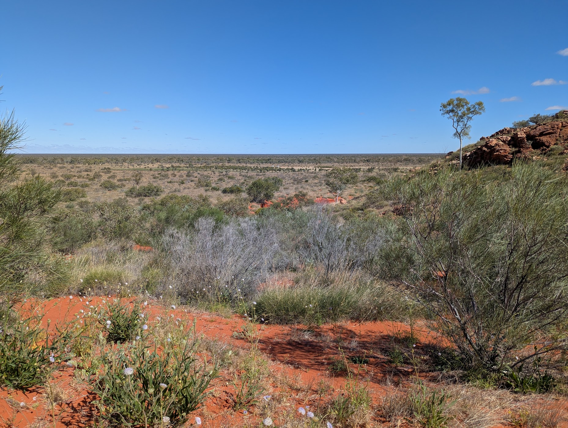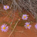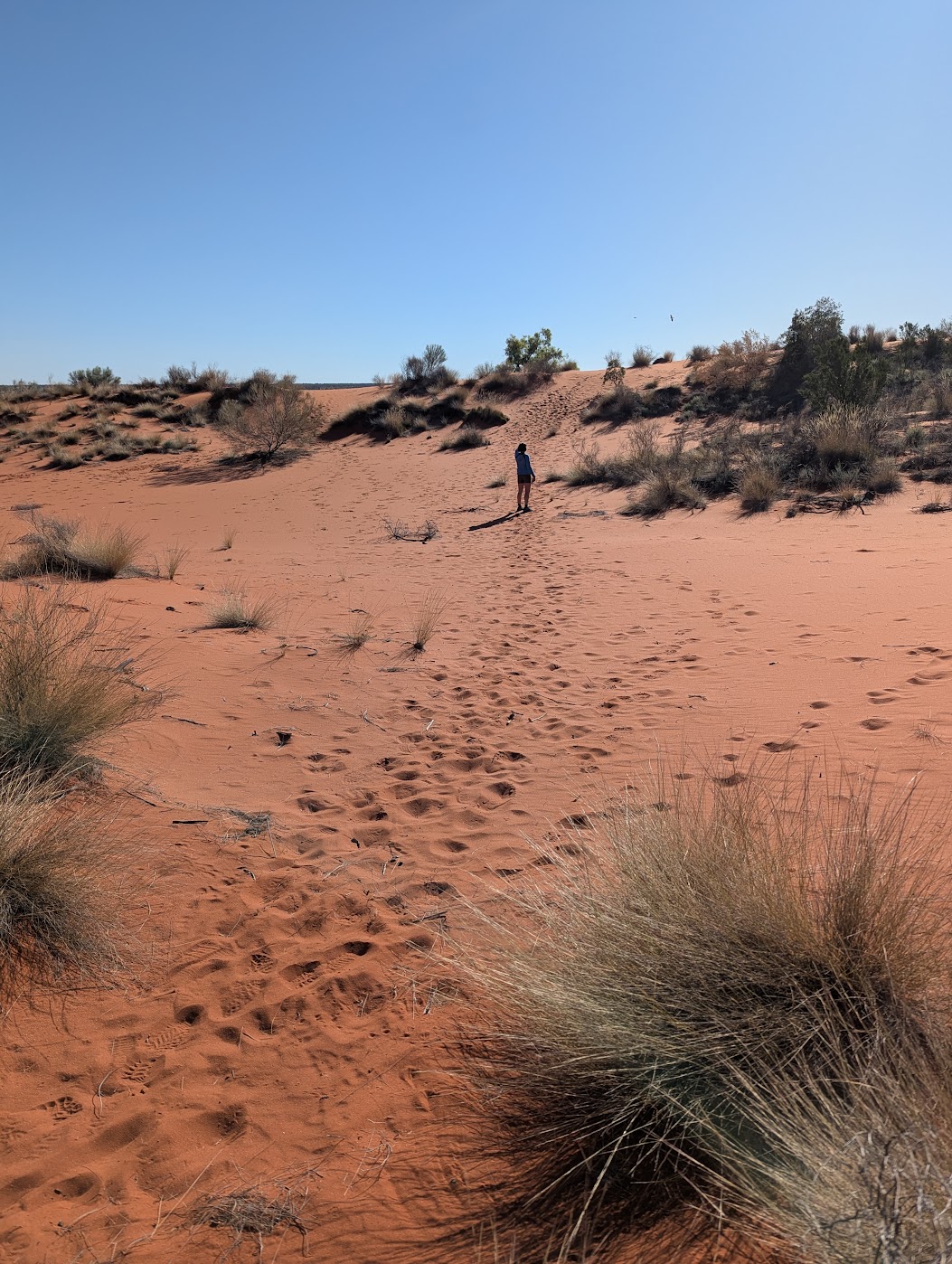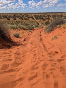 There are no walks in Welford NP but there are drives. The Mulga drive took us through river flats and mulga bushland, past historic stockyards and waterholes. White and purple wildflowers covered this section of the park. The upper part of the drive was still closed due to flooding washouts. The Desert drive is perhaps the best of the drives. The road takes you through Mitchell grass plains, mulga woodlands, past a waterhole, vibrant red sand dunes (the first of many on this trip), white ghost gums, pastoral relics and capped oil and water bores. A walk up the impossibly red dune showed evidence of animal tracks and the flora surviving on the dunes.