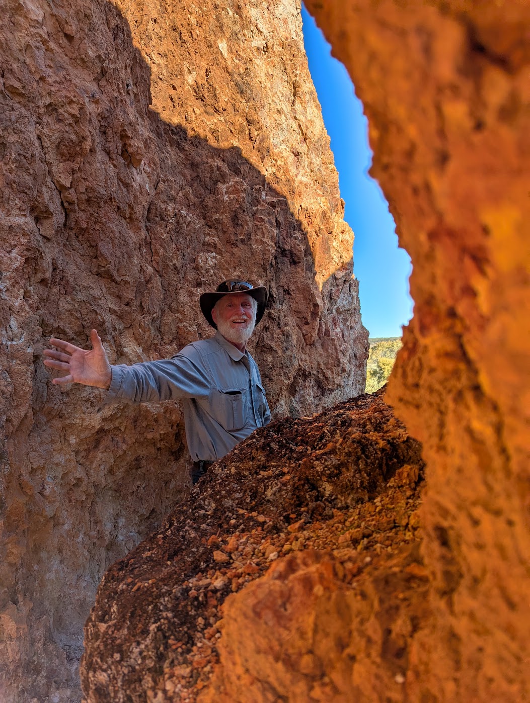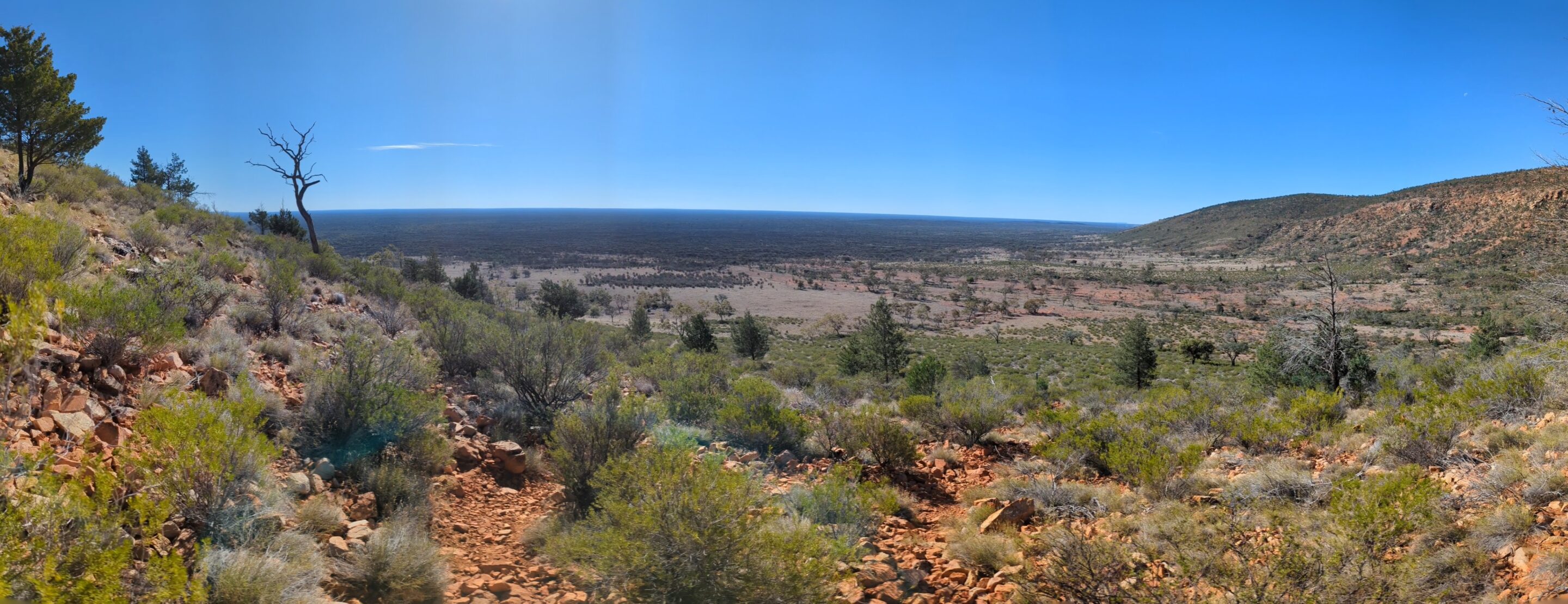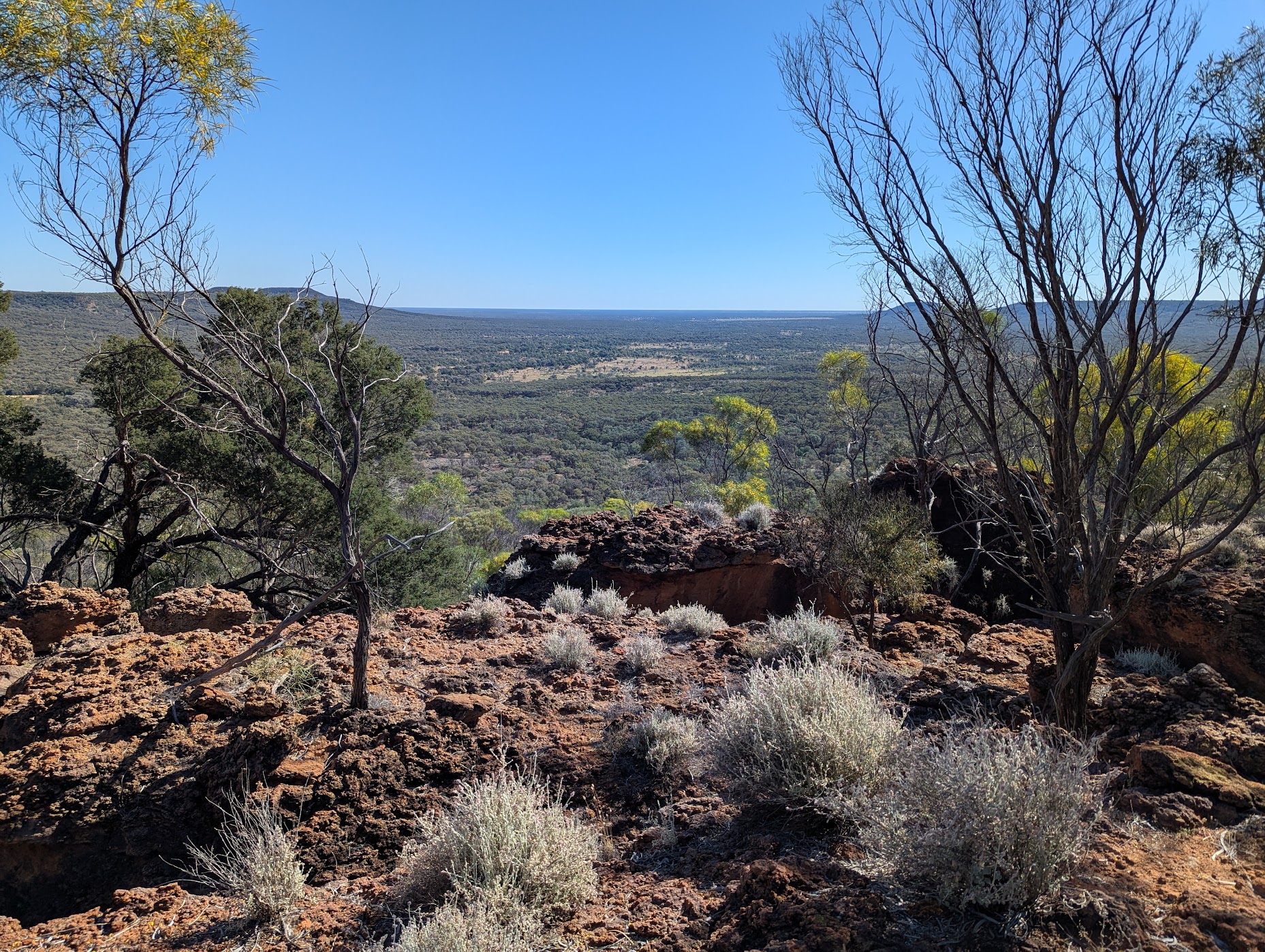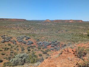 Our second dinosaur experience was at Lark Quarry Conservation Park. This was the original dinosaur stampede site and was an excellent display with over 3000 footprints on the rock face. The conservation park also has two walks: the Spinifex Circuit with a lookout at the end of the track with views of the Mitchell grasslands and channel country, and the Jump Up Loop walk. This walk begins easily and then climbs the western escarpment before descending to the carpark. The views at the top are impressive.