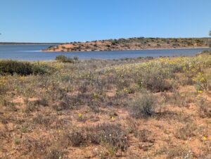 The campsite was not far from the lake shore. Walking on the lake bed is prohibited but a walk along the edge through the low hardy shrubs was interesting. Rabbits are a pest in most parts of Australia and we saw evidence of their survival here. We didn’t see as many birds as expected but with the large amount of water they had many areas to land and roost.