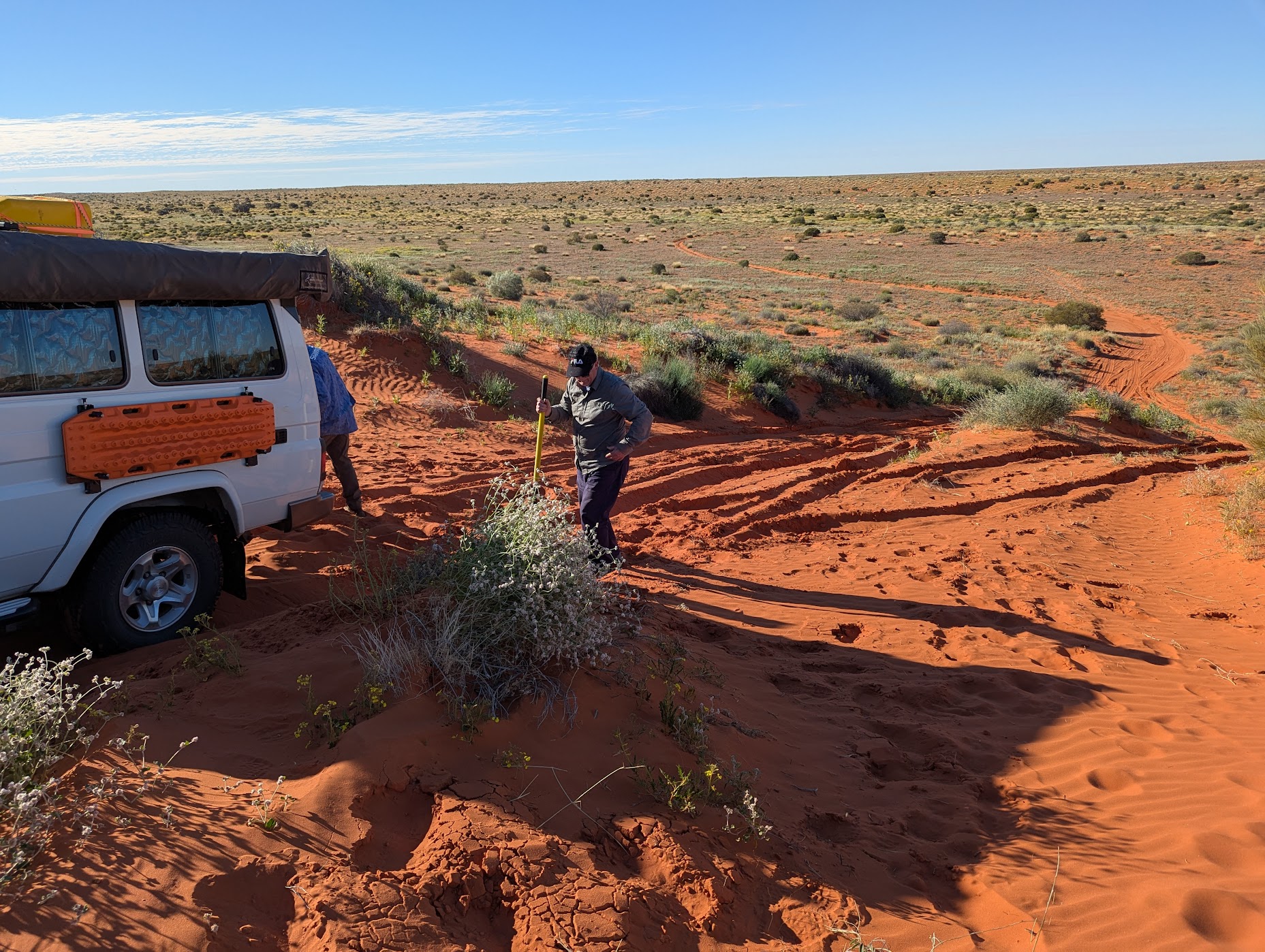 A stop at Madigan camp 16 and the blaze tree was disappointing as we couldn’t distinguish the blaze. We saw budgies, crimson chats, and plenty of camel, emu and dog tracks. Next stop was Beachcomber No 1 well. Many 4WDing skills were required as we continued south with long, steep gnarly dune ascents and diversions around washouts.
