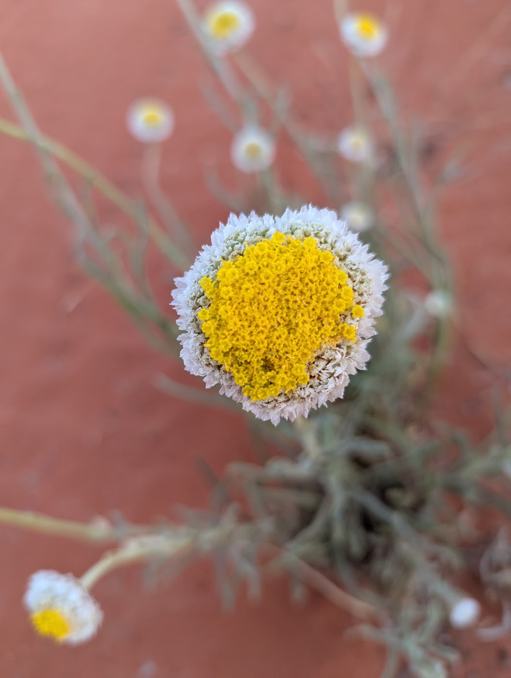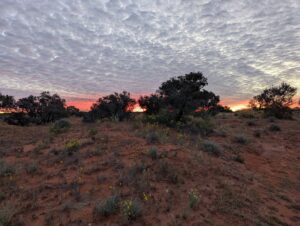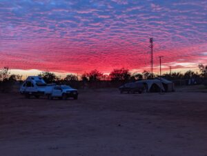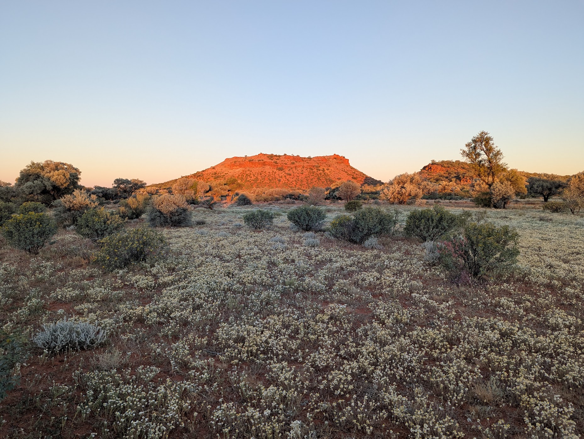 Batton Hill camp, at the north of the Hay River Track, is neglected. The vision of the founders has been lost with the younger generations. So, we aimed for Goyder’s Pillar. The pillar is on a private cattle station so permission is required to enter. Access to the pillar was not simple with deep ruts caused by flooding. The track became impassable so we backtracked and set up camp in a daisy wildflower meadow beneath the Adam Range. This would have to be the prettiest camp with the carpet of wildflowers and the sunset bringing out the vibrant oranges and reds of the sandstone range behind.