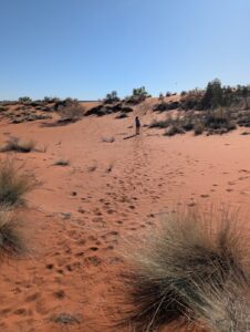 There was a large detour around a flooded claypan but we finally were on the French Line. The dunes were smaller and not as difficult as previous days but there were lots of moguls which made for a very rocky ride. Turning south we joined the Knolls Track before joining the WAA Line. The Knolls Track was slow, even though you are driving between the sand dunes, as the track is rough and bumpy with exposed limestone. Once out of the limestone the track becomes corrugated and vegetation grows close to the track especially across the top of a dune ridge. Approdinna Attora are the remnants of two ancient dunes of gypsum standing on their own. The walk to the top is well worthwhile with views of the surrounding desert and salt lake.