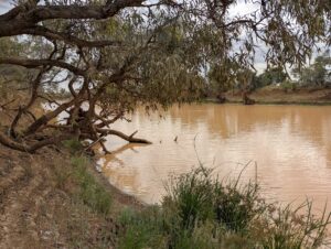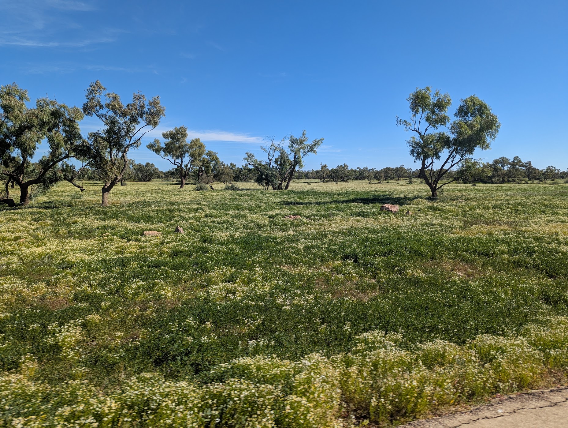 It was good news as the Hungerford Road had reopened to the Queensland border and into the park. There was some water lying on the gravel road edges but the road itself was dusty and relatively smooth. The milky coloured rivers and creeks were still high, including the Ourimperee waterhole where we camped among the coolabahs and river red gums, along with egrets and pelicans. White flowers bloomed in the surrounding area.