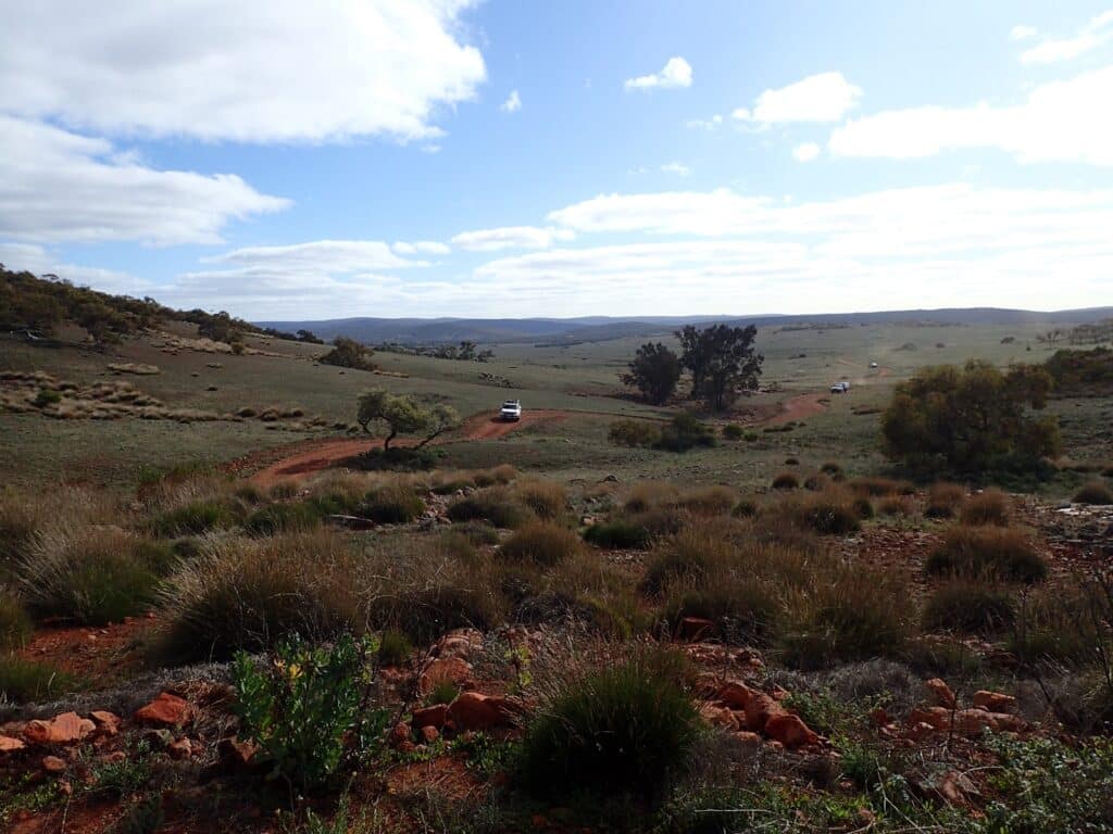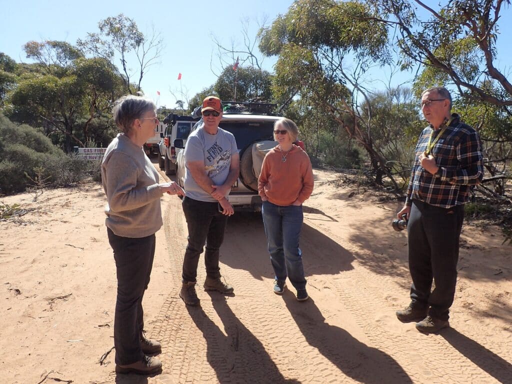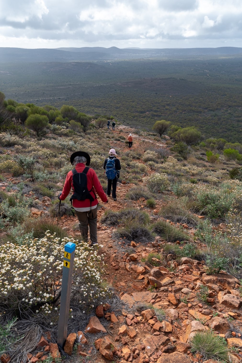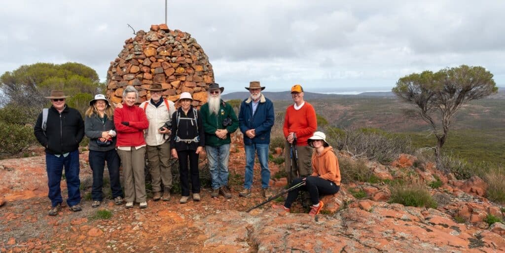 Next day the group ascended Scrubby Peak. Some found the walk challenging but worth the effort. Returning to camp around 11.00am we headed south through fields of orchids on Yardea Road and then turned east on the Old Paney Scenic Route for lunch at Old Paney homestead. A display in the homestead and historic walk outlines the history, exploration and life challenges associated to the 1860s pastoral leases. Further along the track the group walked to Policemans’ Dam. The police had a network of stone huts allowing them to patrol the ranges to support the pastoralists. Overstocking, drought, depression and high transportation costs saw the pastoralists leave the land in the early 20th century.