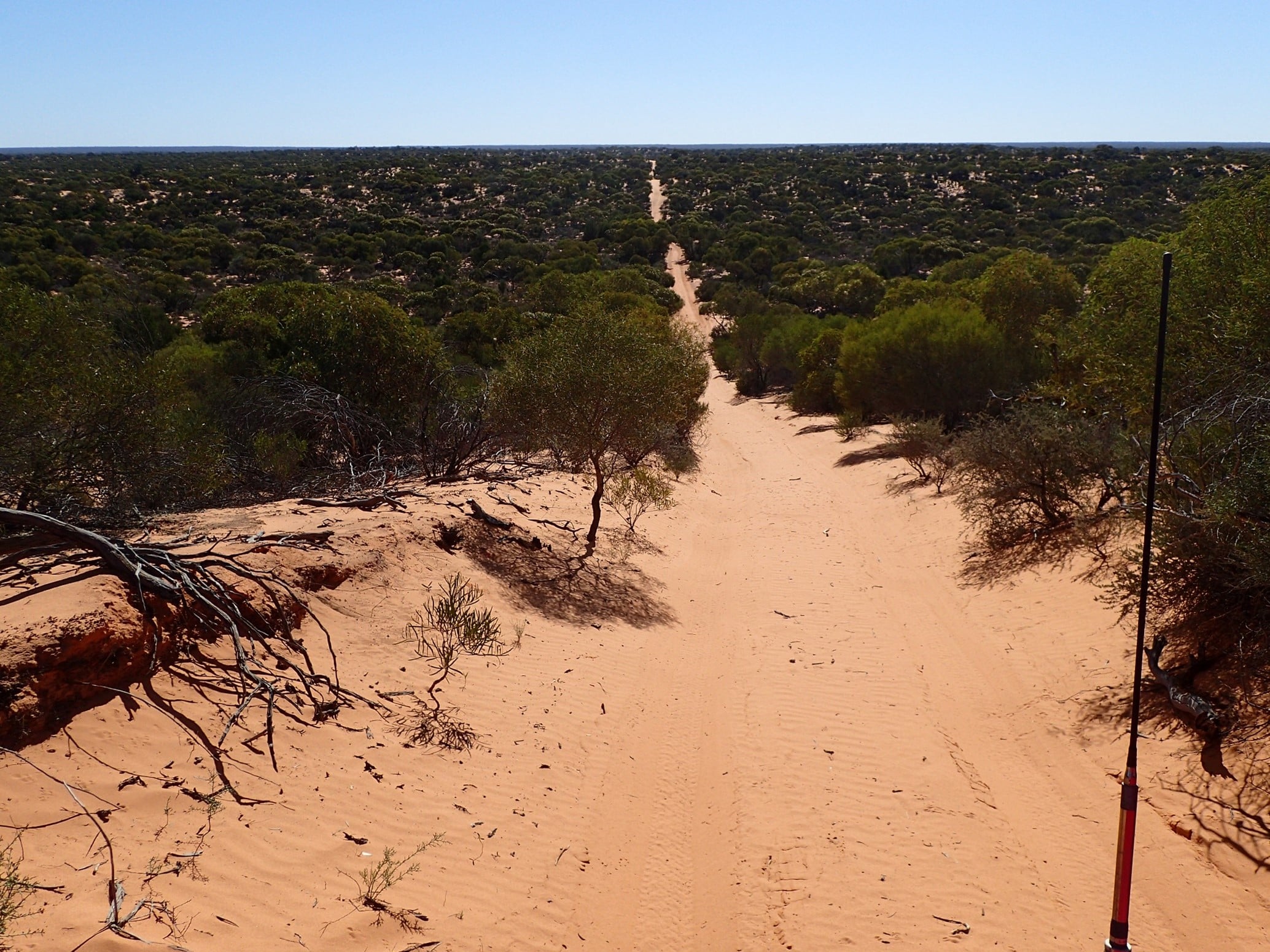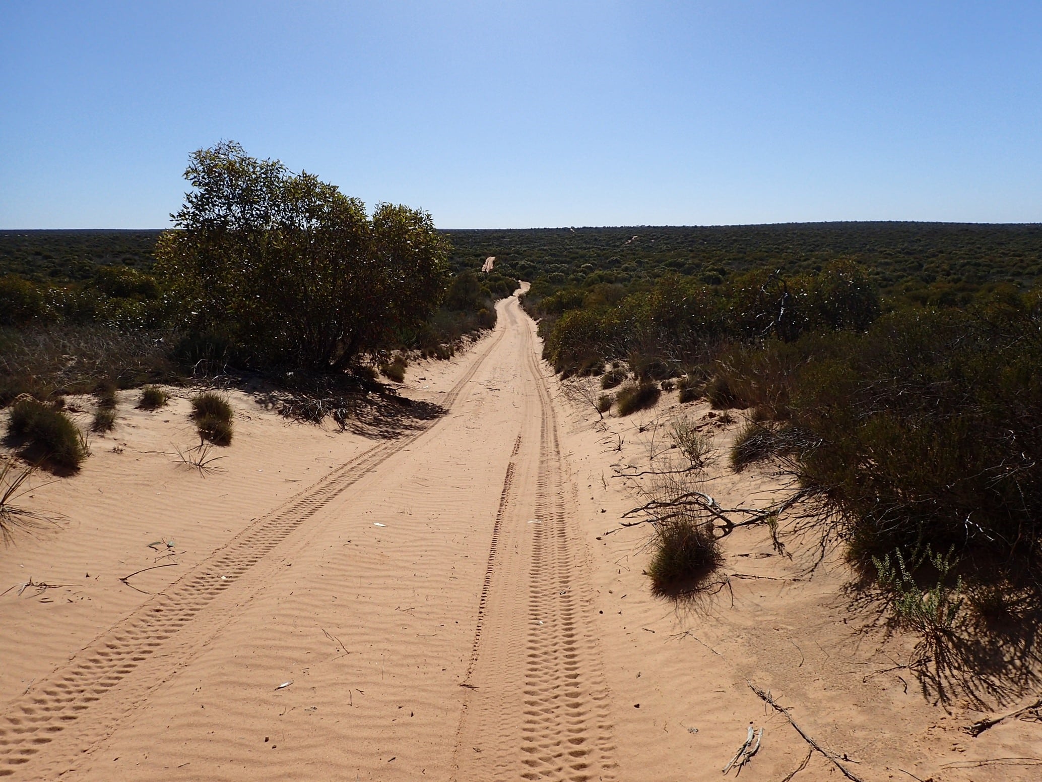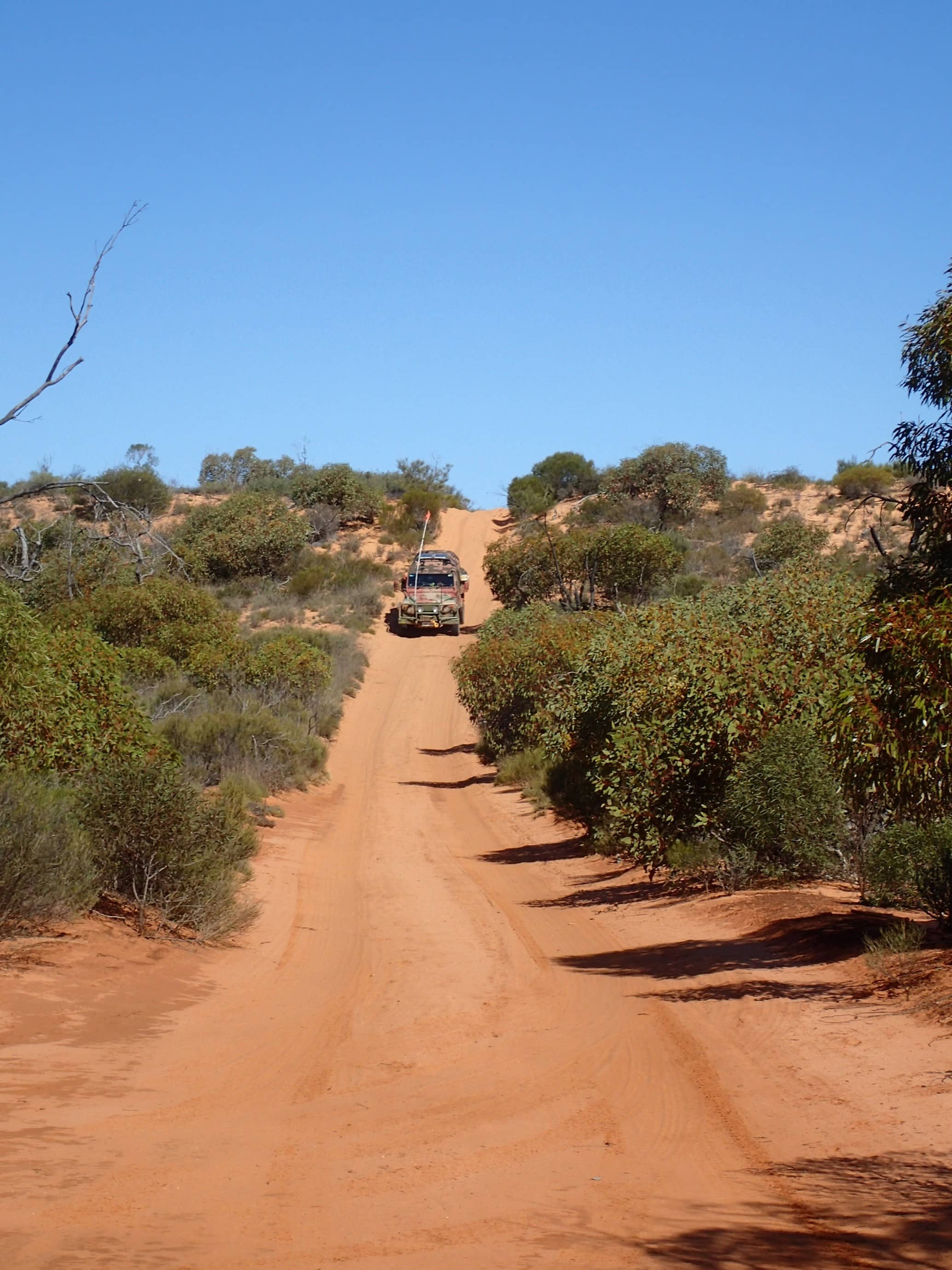 The next day we returned to the memorial. The monuments honour the work of Goog and his son, Martin (Dinger), to construct the track. From here we headed north facing the challenge of larger sandhills as we entered Yellabinna Regional Reserve. Many of the sandhills had been dug up by the spinning wheels of vehicles in a hurry and with high tyre pressures. In contrast we took our time navigating the wombat holes in low range second gear with locked diffs. Wildflowers dotted the mallee scrub and red sand dunes.
