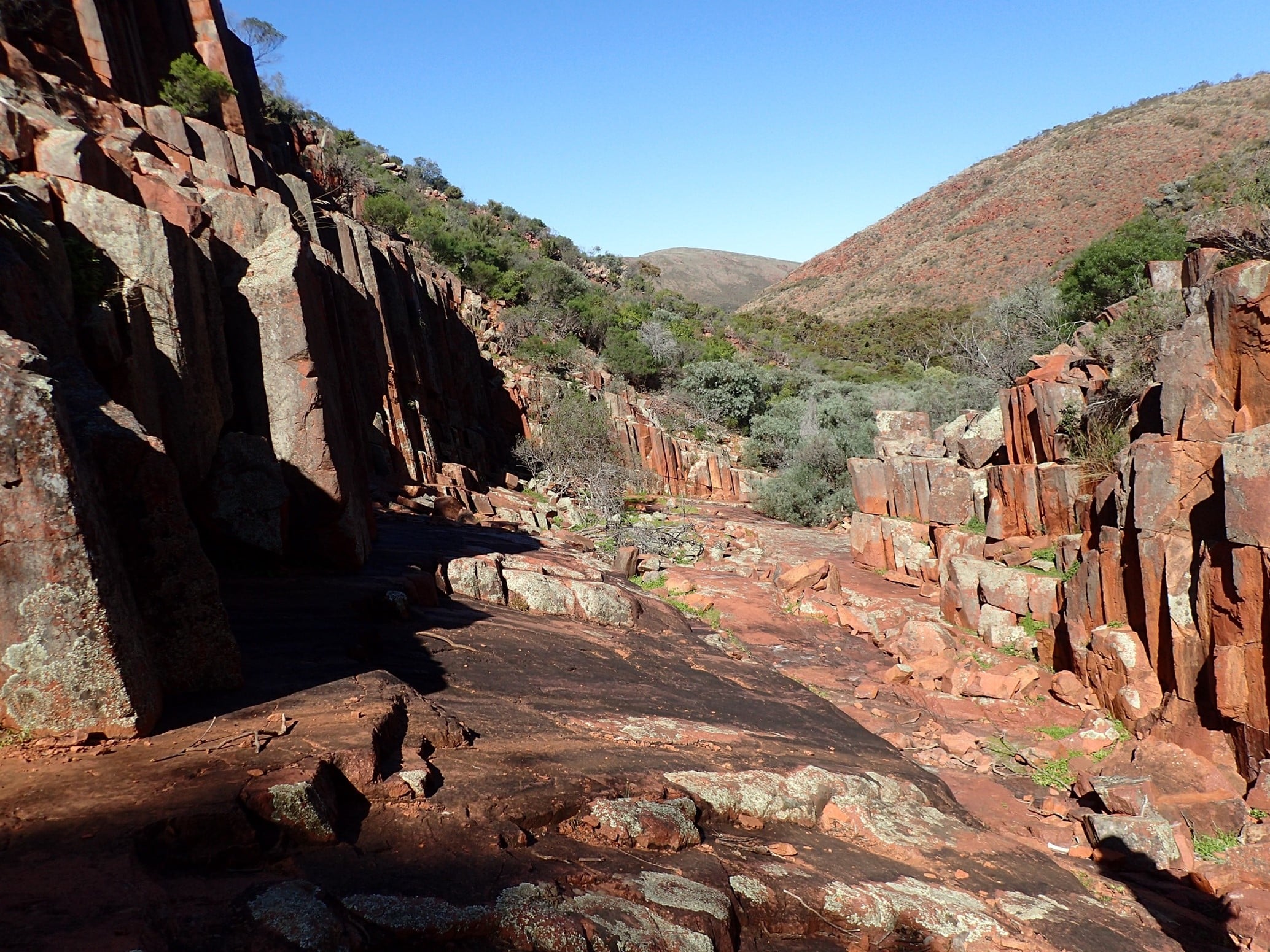We journeyed south through the park to the Organ Pipes. There is a short walk through gums which opens up to a mass of octagonal rock formations through which a creek would flow after rain. The scene is spectacular and we spent some time exploring the hillsides and creek. Returning north we set up camp at the spacious Scrubby Peak campground nestled amongst the mallee trees.