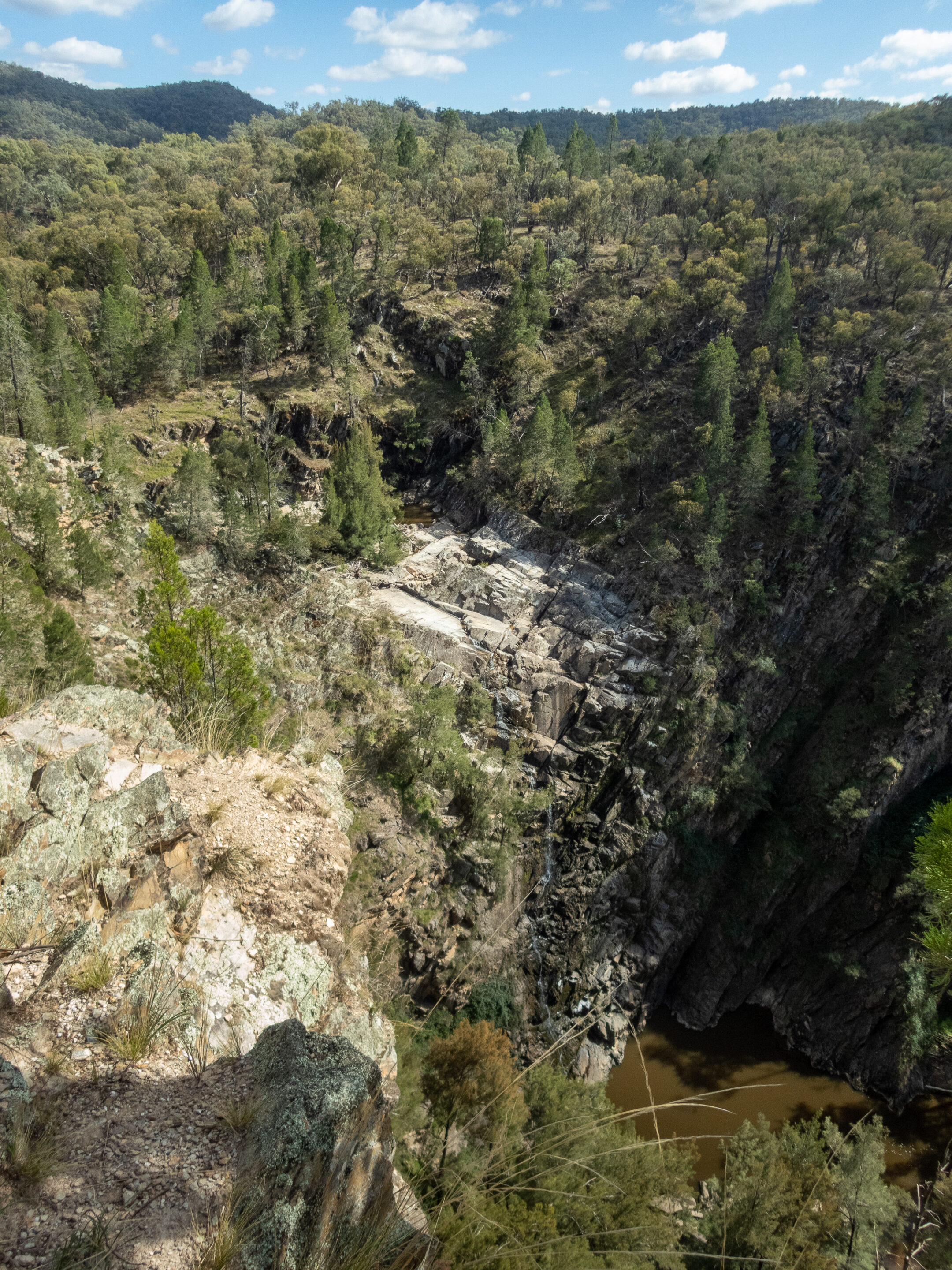 The de Jonghs arrived 10 minutes early in Gunning but were the last to arrive; hence we are doing the trip report.  Heading north via the Biala Wind Farm and Grabben Gullen the convoy travelled to Crookwell, meeting Kaylene and Paul, then onward to Tuena.  Sitting on Tuena Creek, a tributary of the Abercrombie River, gold was discovered at Tuena in 1851 resulting in a large population growth and the establishment of the town.  The area is also famous for its bushrangers and the Abercrombie Caves.  Fifteen kilometres north we turned off the tar for a morning tea stop at Grove Creek Falls. There is a short walk to a lookout where you can view the creek tumble over a cliff to the rocks 70m below.  There is a swimming hole at the top of the falls and another at the bottom.  The steep climb back from the bottom swimming hole would leave you hot and sweaty and wishing you could have a swim.